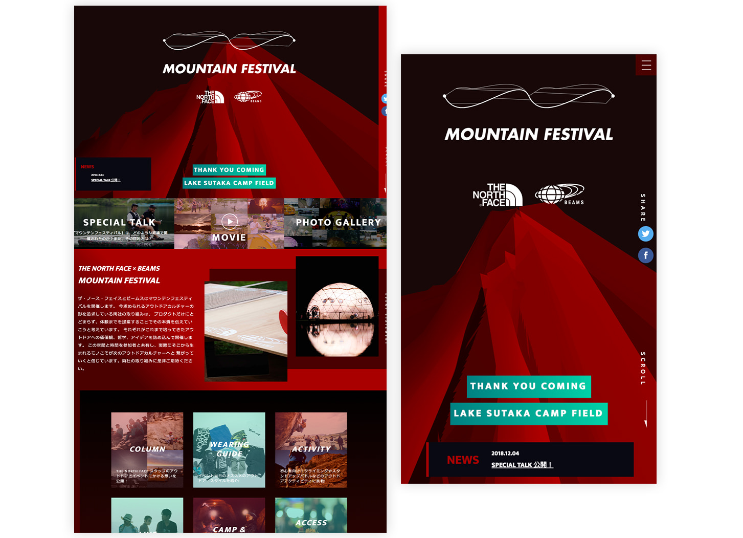 BEAMSとNORTH FACEのコラボアウトドアイベントのサイト制作。小規模ながら二日間に渡るイベントとして、服装、天気、立地などあらゆる情報ページを用意。
