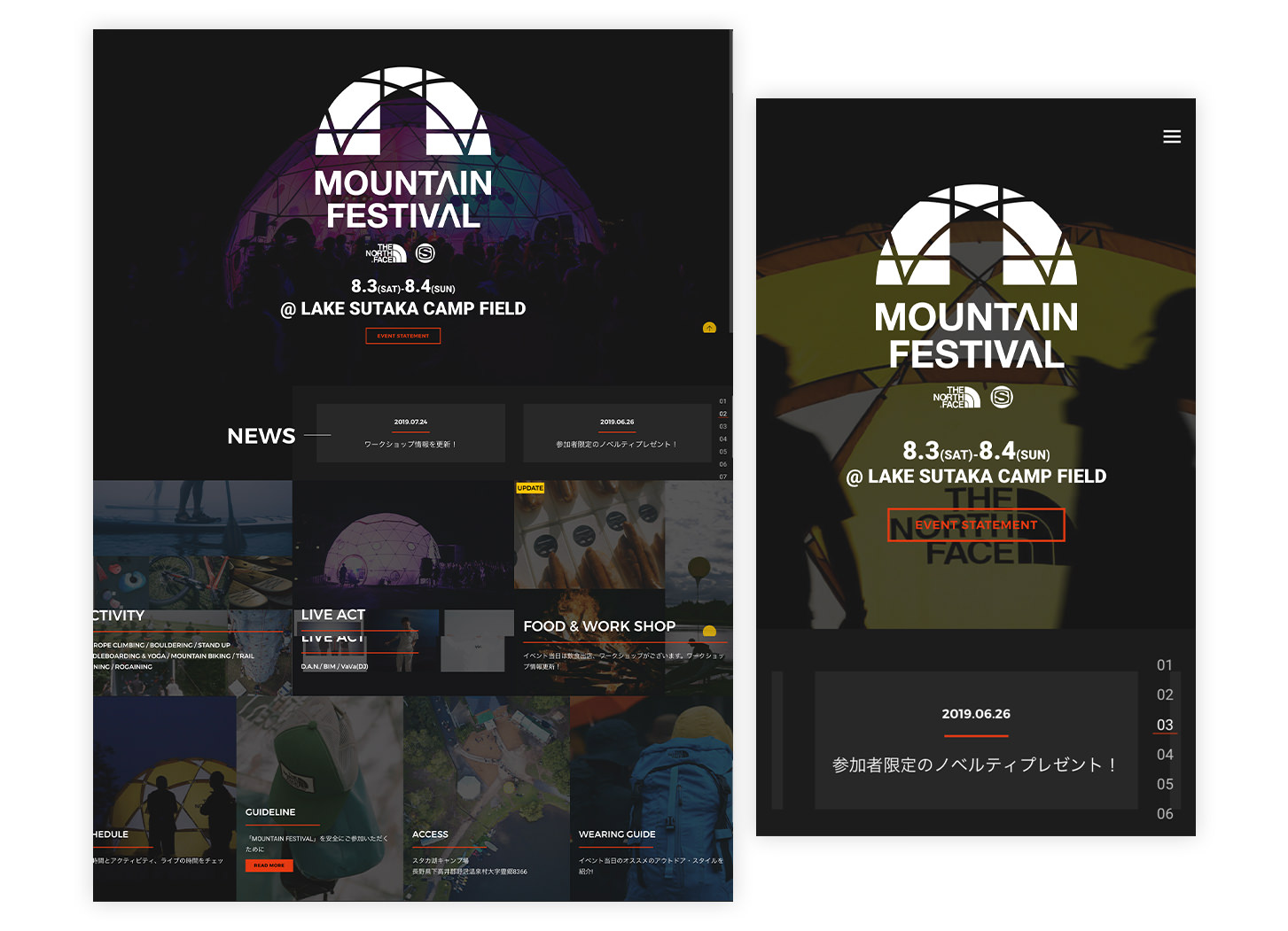 昨年に引き続き、NORTH FACEのアウトドアイベントのサイト制作。小規模ながら二日間に渡るイベントとして、服装、天気、立地などあらゆる情報ページを用意。