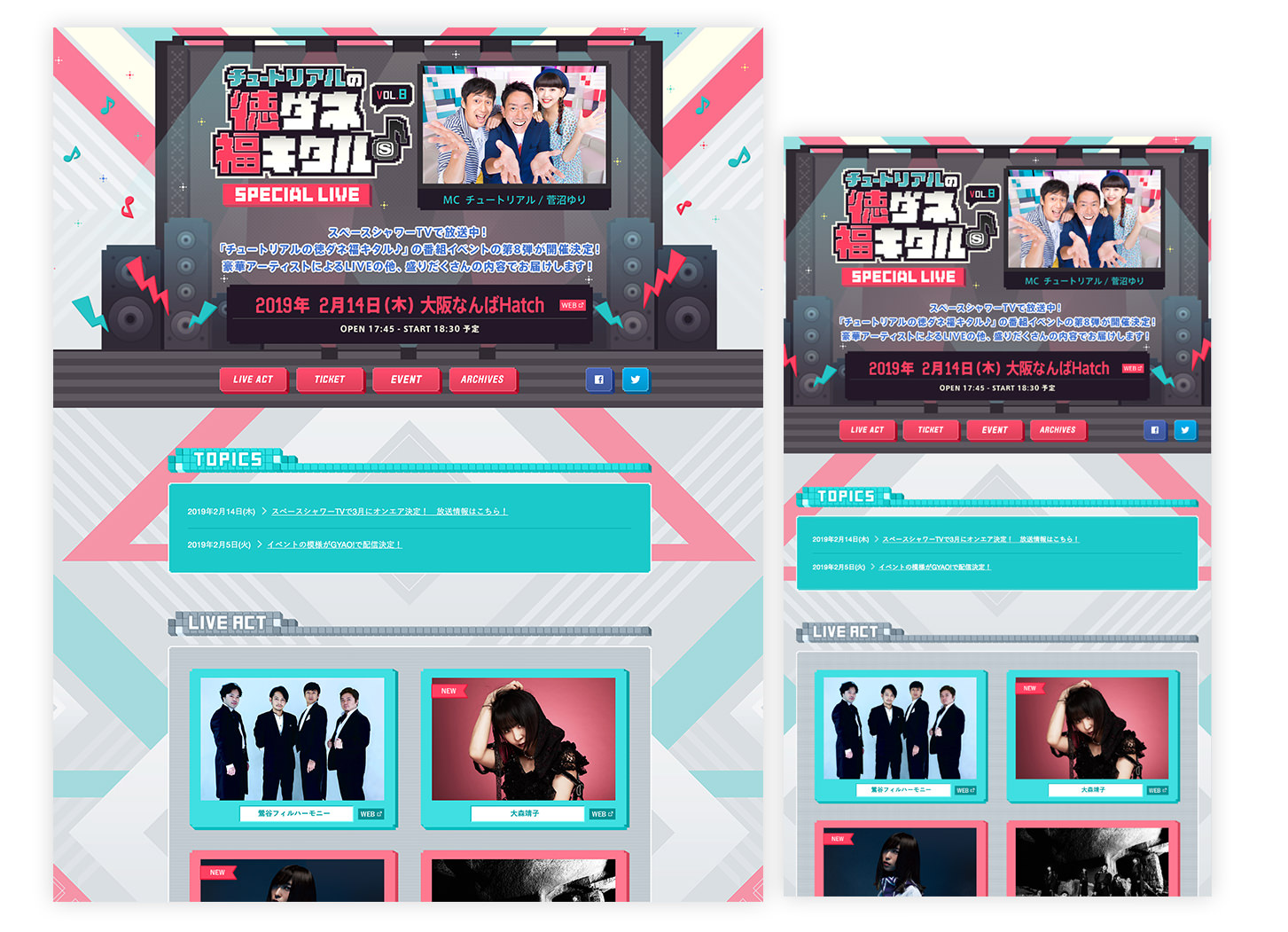 チュートリアルの徳ダネ福 キタルというスペシャ レギュラー番組のライブイベント。 3年間に渡り、9公演を行いサイトの保持と運用、制作を対応。