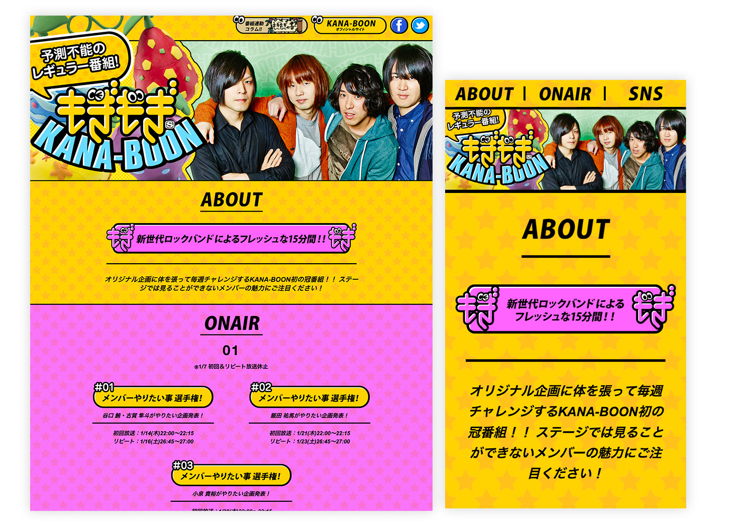 スペシャで放送したレギュラー番組もぎもぎKANA-BOONの番組サイト。サイト制作と放送情報の更新を行う。